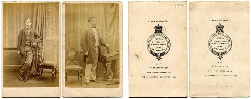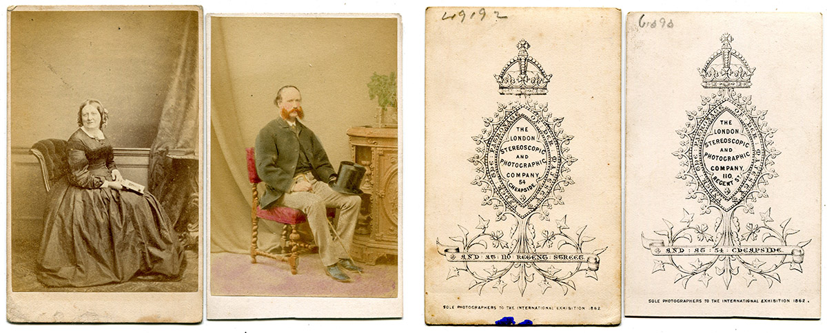 Two CDVs with almost identical reverse patterns, except one lists the Cheapside address first, and the other lists Regent Street first. Presumably, the photographs were produced at the first-named location. Note the hand coloring on the right photograph.