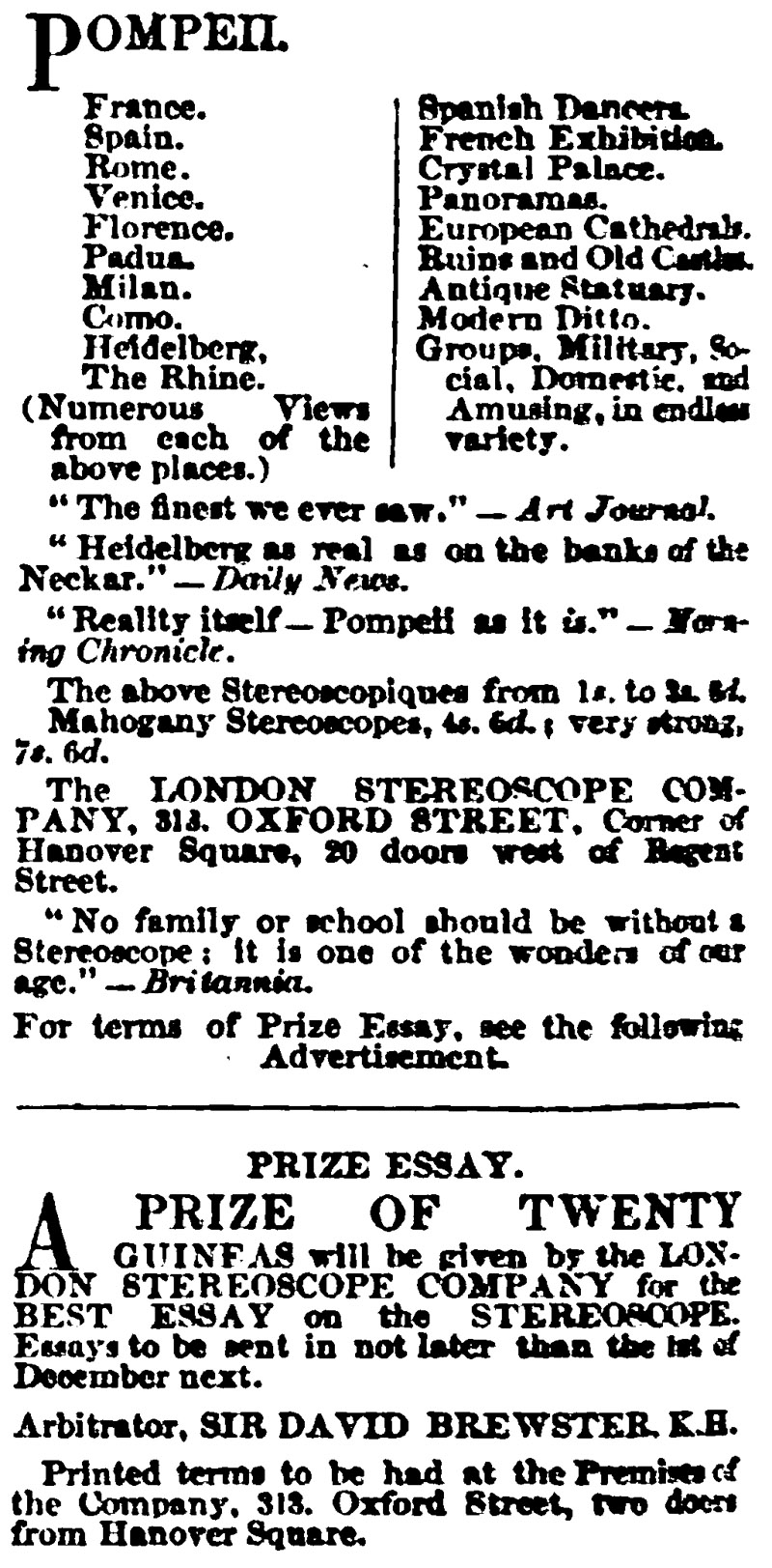The following year, The Art Journal reported “Improved Stereoscope - We had the pleasure of examining, a short time since, at the Repository of Art, 313, Oxford Street, some improvements which have recently been made in these instruments. The great defect hitherto existing has been in their not being adapted to varied sights. This is now overcome by a simple contrivance, which consists of a central screw which heightens or depresses the eye-pieces to suit the sight of every observer. This improvement renders Sir David Brewster's invention perfect. Some views taken by the artists of the company were the finest in tone and sharpness that we ever saw”.