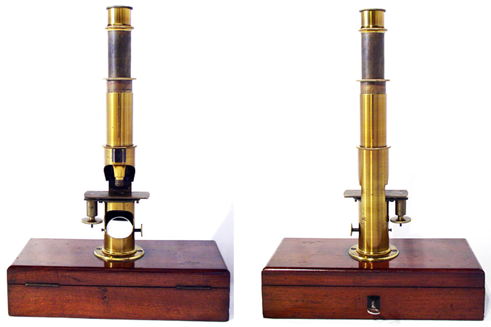 Two small Oberhaeuser microscopes: left, serial number 638, manufactured ca. 1840; right; serial number 1555, manufactured ca. 1848. This model is essentially the same as that made by Trécourt and Oberhaeuser during the mid-1830s (see Figure 4). Adapted by permission of Timo Mappes, http://www.museum-optischer-instrumente.de/oberhaeuser_638.html and http://www.museum-optischer-instrumente.de/oberhaeuser_1555.html.