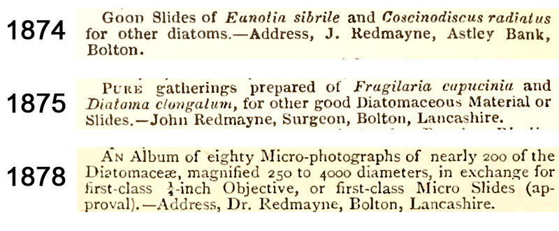 The Northern Microscopist report of the November 19, 1880 Annual Conversazione of the Bolton Microscopical Society stated, “The table possessing a feature of melancholy interest was that covered with the microscopes and rich work of the late Dr. Redmayne, one of the founders of this Society. The presence of his photo-micrographs, the varied assortment of pathological preparations and rare diatoms made it hard to believe that he was not present also.“