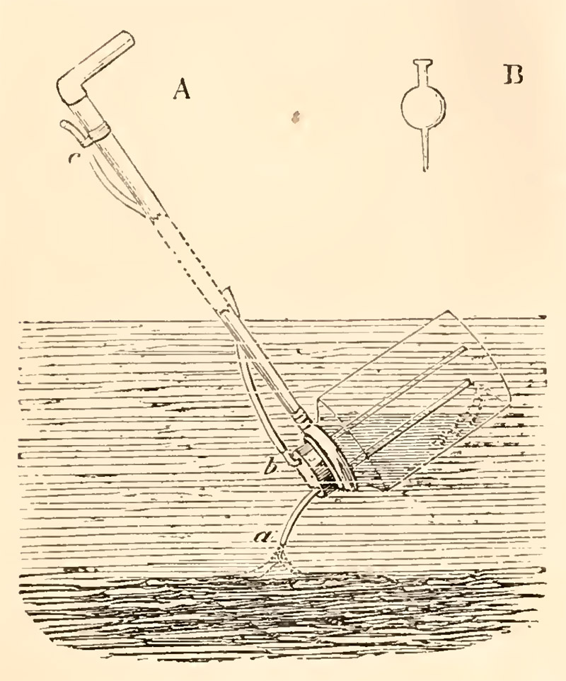 To use the apparatus, the thumb of the right hand must press the tube firmly against the stick at c, and the bottle lowered until the mouth of the tube (a) is within a quarter of an inch from the surface of the diatoms; the thumb is then to be raised, and if the water is deep, the bottle will fill by atmospheric pressure, carrying the diatoms in at the same time. In shallow water suction will be necessary to exhaust the air in the bottle: in that case a ball pipette (fig. B) will be useful as a mouthpiece.