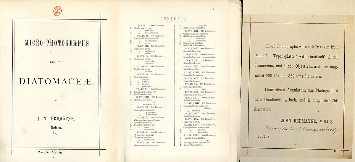 Front page, table of contents, and technical details from Redmayne’s 1877 book of diatom photomicrographs. Adapted with permission from http://www.canadiannaturephotographer.com/Redmayne_diatoms.html.