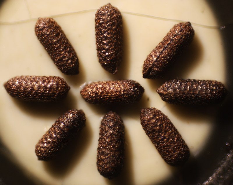 4x magnified view of seeds from chickweed, Stellaria media, arranged by Isaac Stidham.