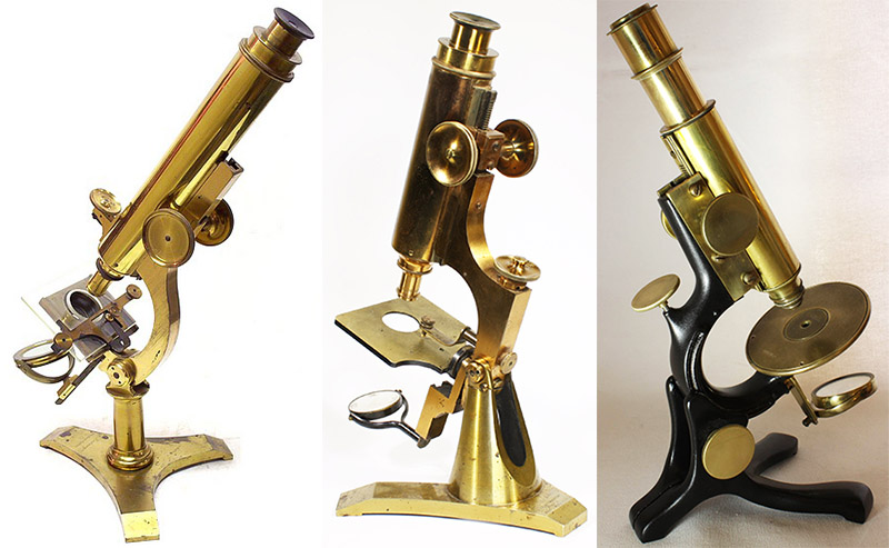 Examples of microscopes that Isaac Stidham used in 1896. It is likely that he owned one of each model. Left to right: Zentmayer Army Hospital, Zentmayer Histological, and Wales New Working. The left image is adapted from http://www.antique-microscopes.com/photos/Zentmayer_Army_monocularr_975.htm, the right image from http://www.microscope-antiques.com/walewithengr.html, and the center image from the author’s collection.