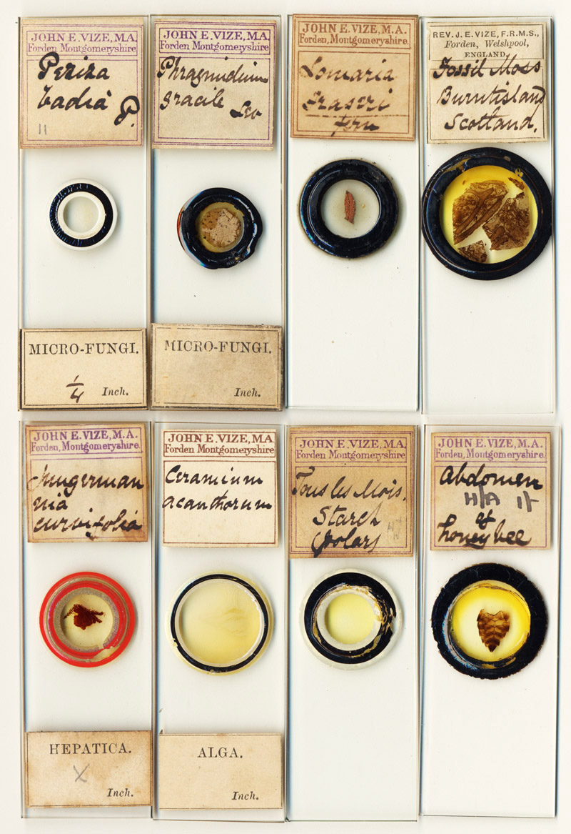 John Vize was a classic example of a Victorian English scientist, being an educated man with sufficient spare time and energy to investigate the workings of the world around him. Vize was an ordained Anglican minister. Throughout much of his life, he involved himself with the local scientific community wherever he was stationed. Vize’s studies emphasized fungi, particularly those which required a microscope for investigation. However, surviving slides and other historical records indicate a broad range of interests. He also wrote extensively about the history of Forden, Wales, where he spent several decades as Vicar.