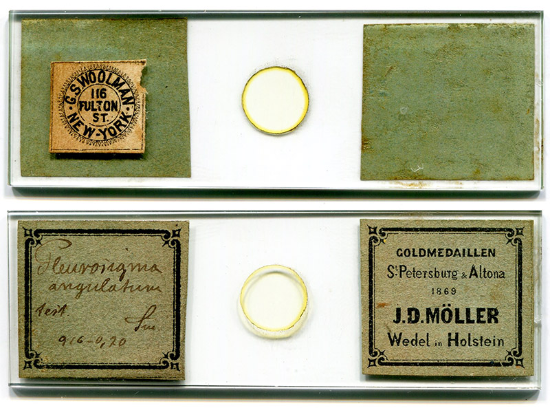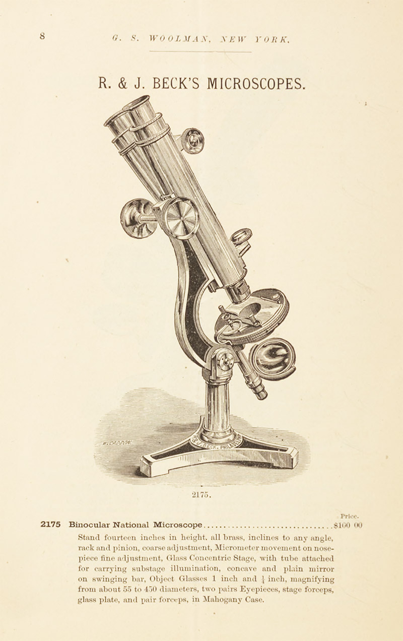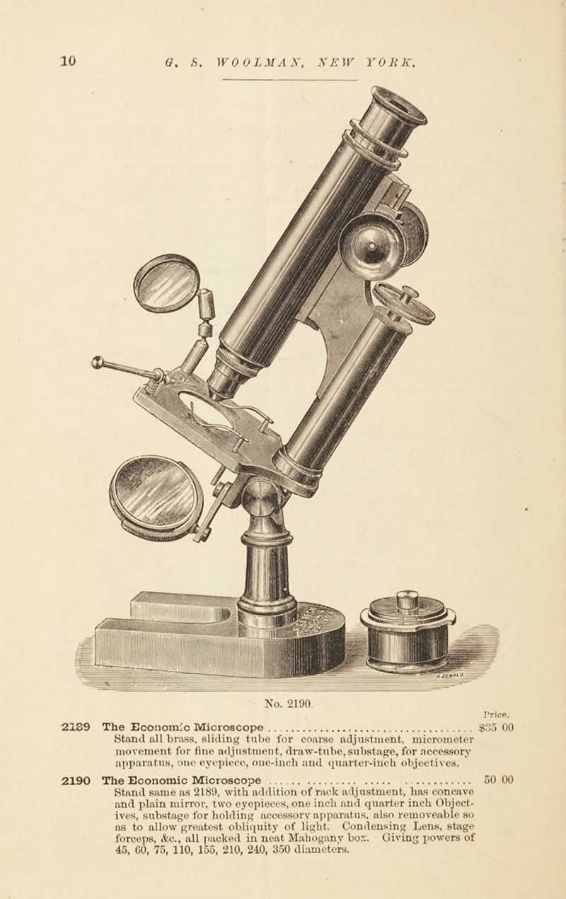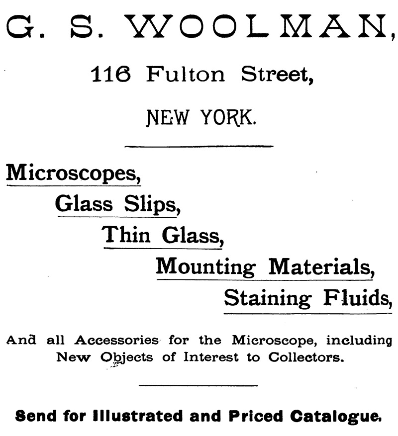 Between 1876 and 1894, G.S. Woolman's New York City shop was a major supplier of microscopes and other scientific and engineering equipment. Contemporary sources indicate that Woolman distributed his products throughout the U.S.A. Microscopes, slides, and other apparatus from Woolman are often seen in collections (Figures 1 and 2).