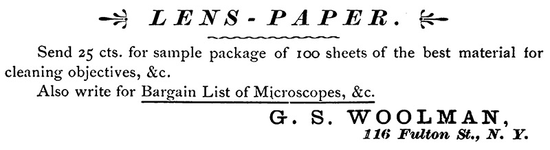 Woolman was credited for introducing America to disposable paper wipes for cleaning lenses, as described by The American Monthly Microscopical Journal in 1892, "Paper for Cleaning the Lenses of Objectives and Oculars. - The so-called Japanese filter paper (the bibulous paper often used by dentists when filling teeth) is being used for cleaning the lenses of oculars and objectives. Whenever a piece is used once it is thrown away. It is more satisfactory than cloth or chamois, because dust and sand are not present, and from its bibulous character it is very efficient in removing liquid or semiliquid substances. Use it for removing immersion fluid from objectives, cloudiness or dirt from eye-pieces, glass slips, or thin glass. Water, glycerine, or other fluids can be removed. It is very cheap. It is put up in packages of 500 sheets, 10 x 7 inches, at $1.00, and 100 sheets, 10 x 7 inches, at 25c. It is for sale by nearly all dealers in microscopes and materials. G. S. Woolman, 116 Fulton st., New York, is the one who has introduced these cheap packages" (Figure 14).