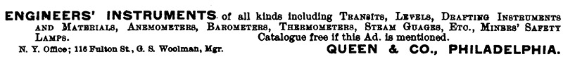Engineering and Mining Journal (1894) "Queen & Co., Philadelphia, have purchased the stock and business of G. S. Woolman, dealer in mathematical instruments and engineers' supplies", Vol. 57, page 467