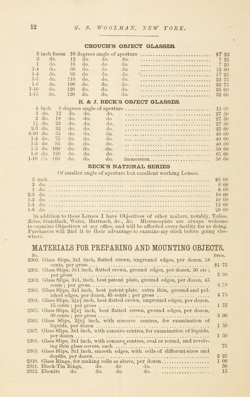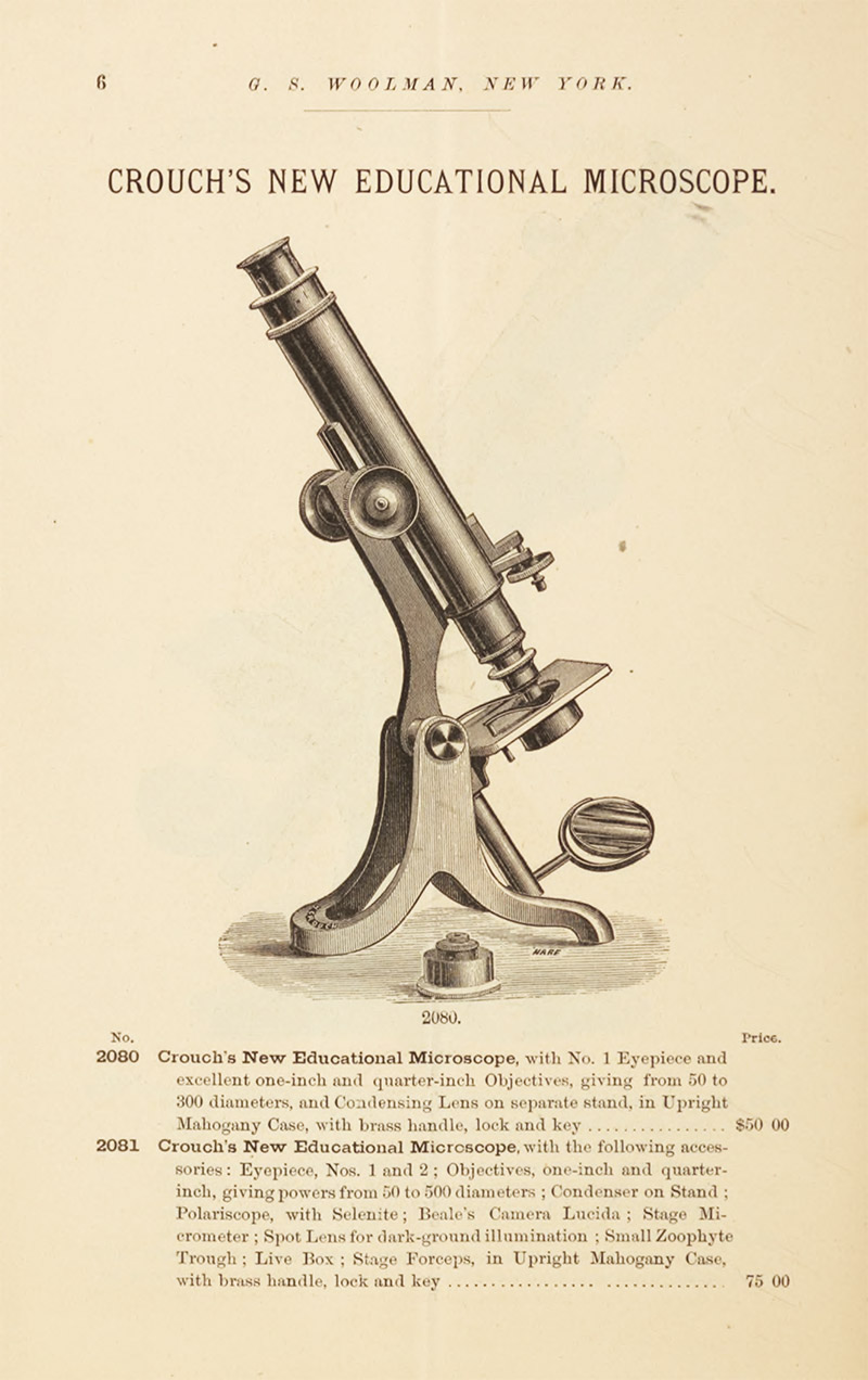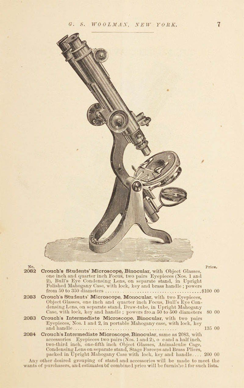 Woolman's 1879 microscope catalogue shows that he retailed instruments by Queen, Henry Crouch, R. & J. Beck, and "Acme" (Sidle and Poalk), as well as lenses by Crouch, Beck, and Charles Spencer (Figure 5).