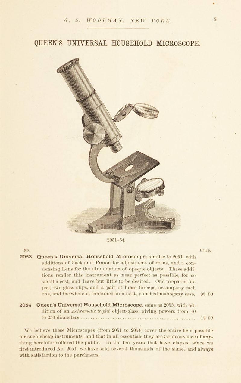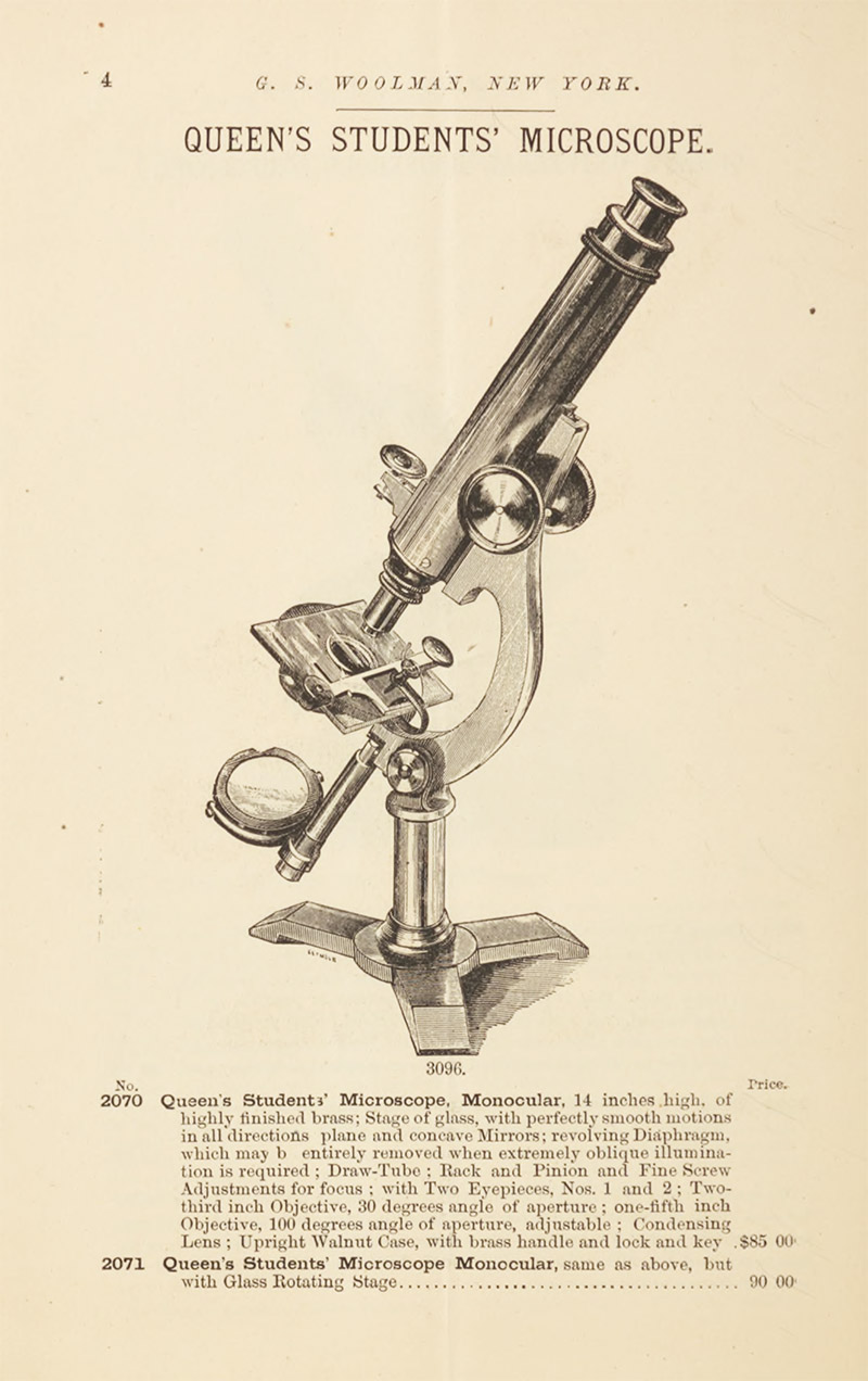 G.S. Woolman's 1879 catalogue of microscopes, which illustrates many of his instruments. At the time, he was distributor for J.W. Queen & Co., Henry Crouch, R. & J. Beck, and "Acme" (Sidle and Poalk).