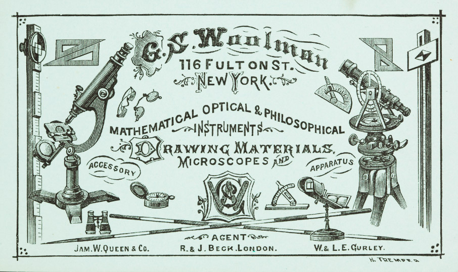 An undated trade card from G.S. Woolman. He was described in the 1888 "Illustrated New York" as being an agent of J.W. Queen & Co., R. & J. Beck, and W. & L.E. Gurley. Adapted for nonprofit, educational purposes from https://www.historicnewengland.org/explore/collections-access/gusn/266837 .
